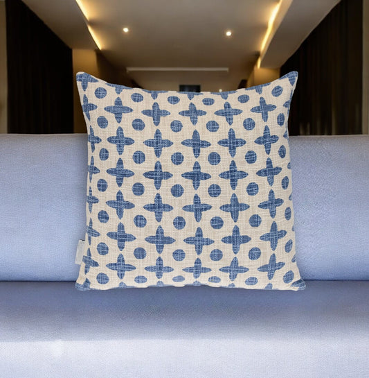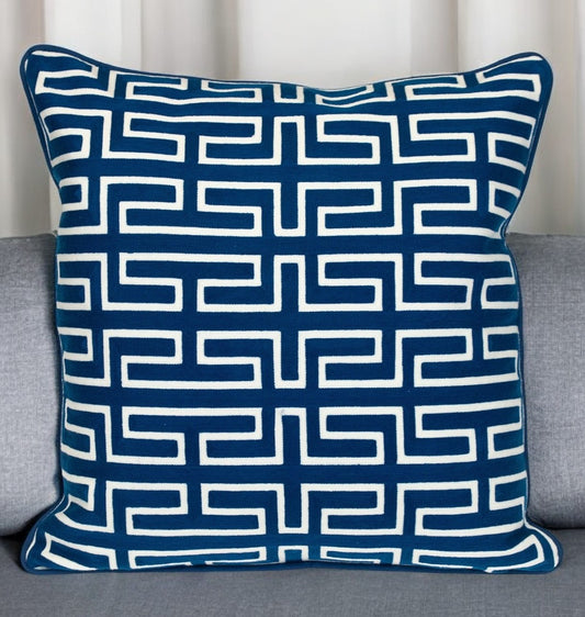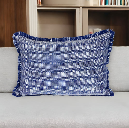 Blue & White Weave Cotton Pillow w/ Pom Poms