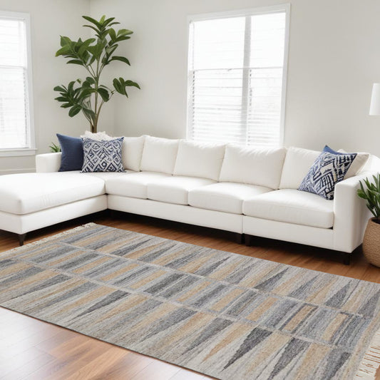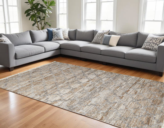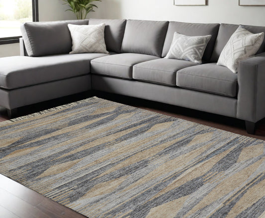 10 x 13 Tan Gray & Ivory Geometric Hand Woven Stain Resistant Rug With Fringe