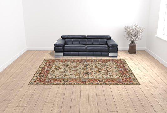10 x 13 Gray Gold & Red Wool Floral Hand Knotted Stain Resistant Rug With Fringe