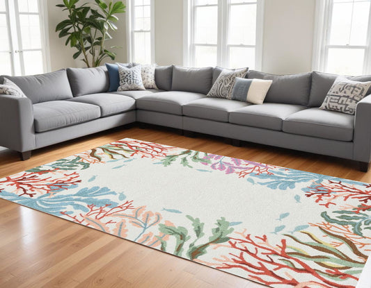 8 x 10 Ivory Hand Hooked Bordered Coral Reef Indoor Rug