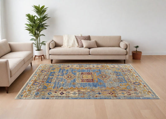 8 x 10 Blue Ivory & Yellow Wool Floral Hand Knotted Rug With Fringe