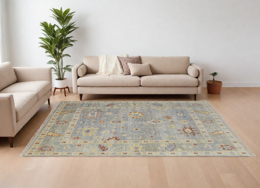 8 x 10 Blue & Gray Wool Floral Hand Knotted Rug With Fringe