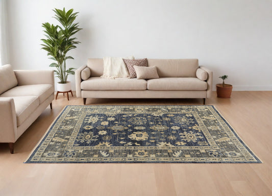 9 x 12 Blue & Gray Wool Floral Hand Knotted Rug With Fringe