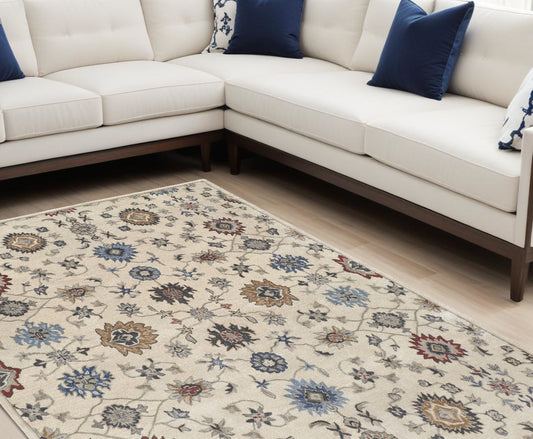 9 x 12 Ivory Tan & Blue Floral Hand Knotted Stain Resistant Rug
