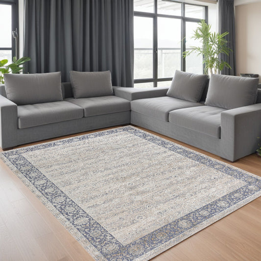 8 x 10 Beige Blue & Ivory Distressed Rug With Fringe