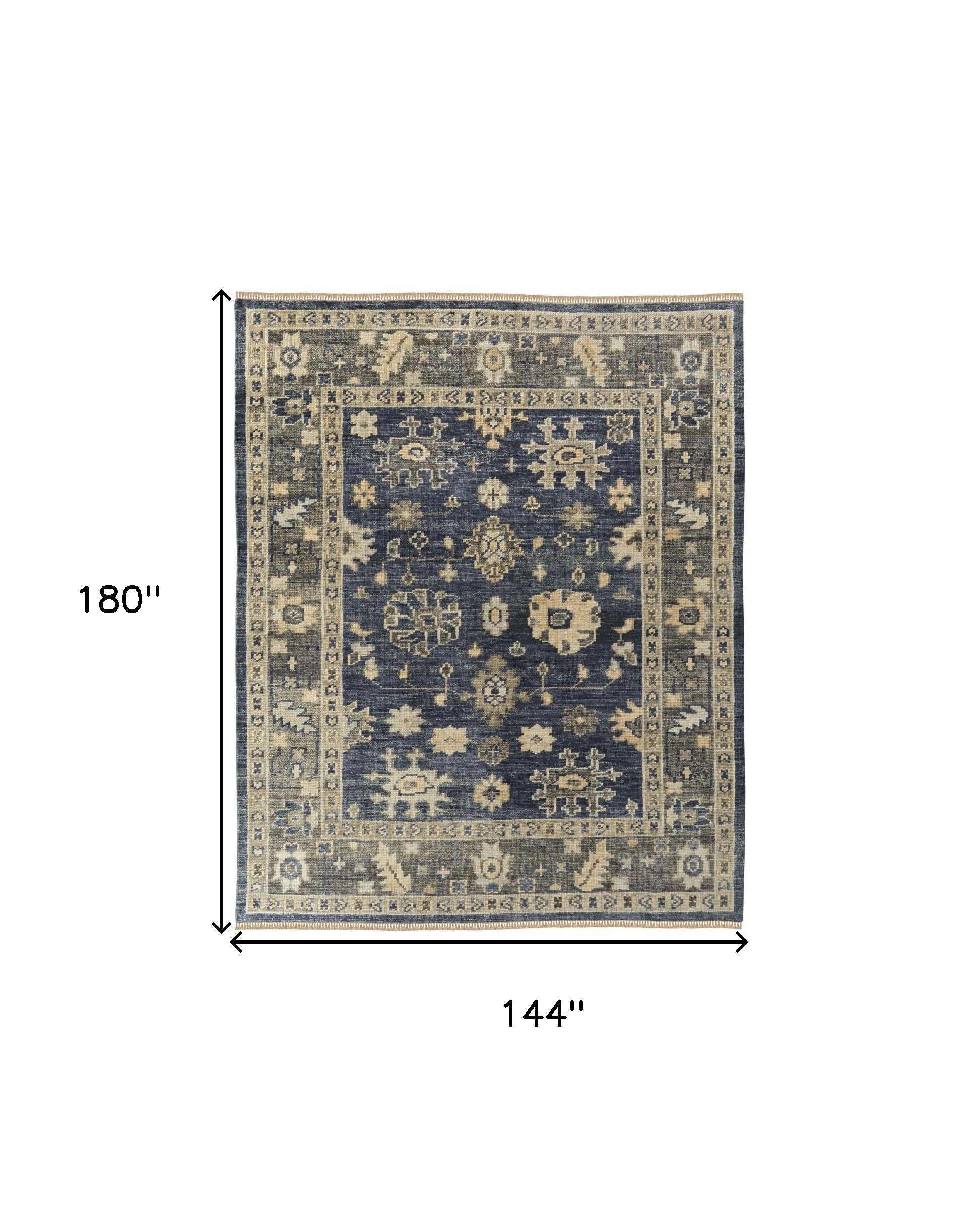 12 x 15 Blue & Gray Wool Floral Hand Knotted Rug With Fringe
