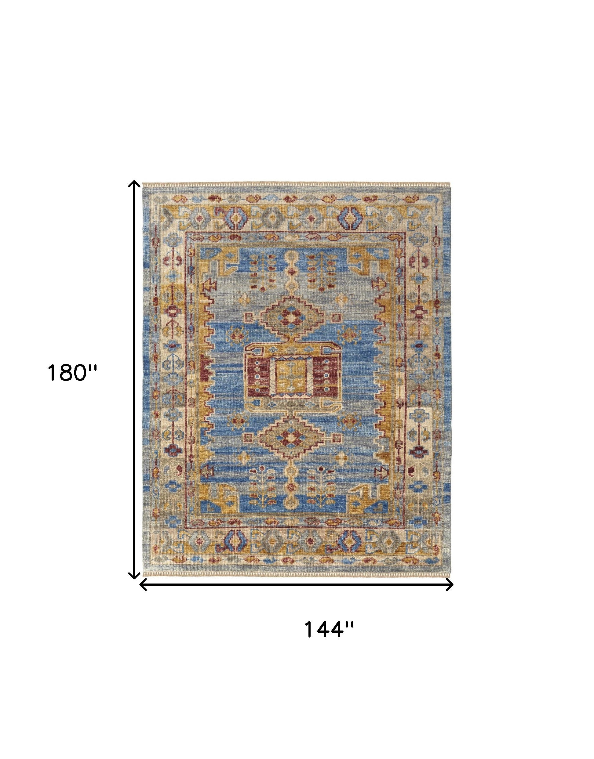 Add great coloration and comfortable texture to your space with this 12-foot x 15-foot blue red and yellow wool geometric hand knotted area rug with fringe. This rectangle shaped rug features a geometric design in blue red and yellow to give it visual interest. A classic shape marries with good looking design for your space ideal for spaces with kids and pets, this rug is stain resistant to help repel stains and spilled liquids. Tassel ends bring a timeless and fashionable look to your interior. Crafted by skilled artisans, this hand knotted rug is genuine and unique. No two will be exactly alike. Place this area rug against a hardwood or tile floor and it will enliven your living space with style and sophistication. 144-inch H x 180-inch W x 0.4-inch D
