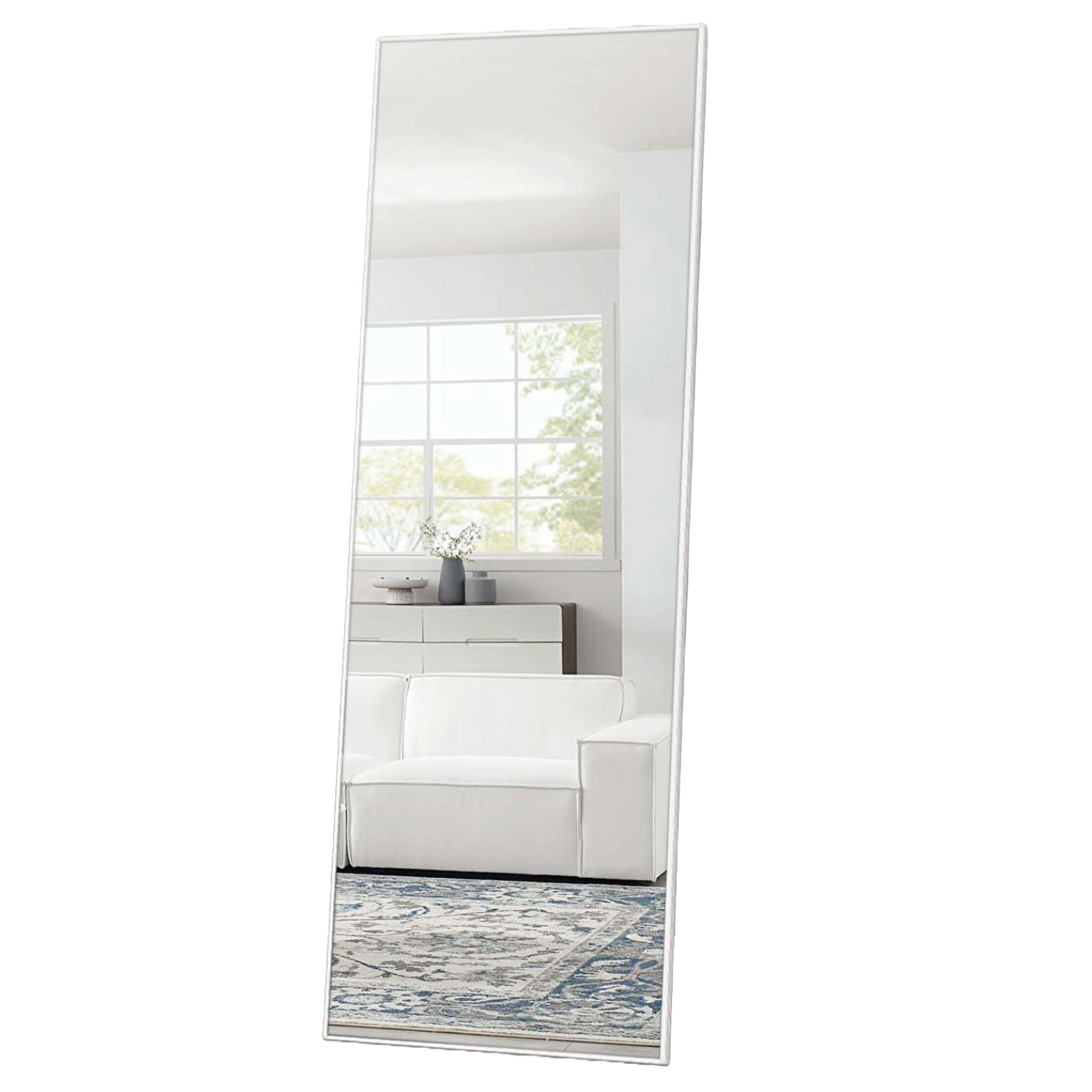 This Freestanding Silver Full-length Floor Mirror is the perfect way to add a touch of design and brightness to any room in your home. This rectangular mirror is encased in a thin silver aluminum alloy frame. This giant mirror can be used as an anchor piece in any room and will brighten and make the space seem much bigger instantly. There is a removable black colored stand to help the mirror stand up freely. Use this minimal mirror in your bedroom, your living room, or your entryway without worrying about any clashing colors or decor styles.