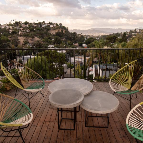 This nesting set of smooth, highly sealed concrete circles are a great fit in a variety of homes. The nesting/accordion nature of being able to pull them out or push them in, customizes the length and width of the grouping to your specific situation, be it a large sectional couch, tighter living room or outdoor patio.