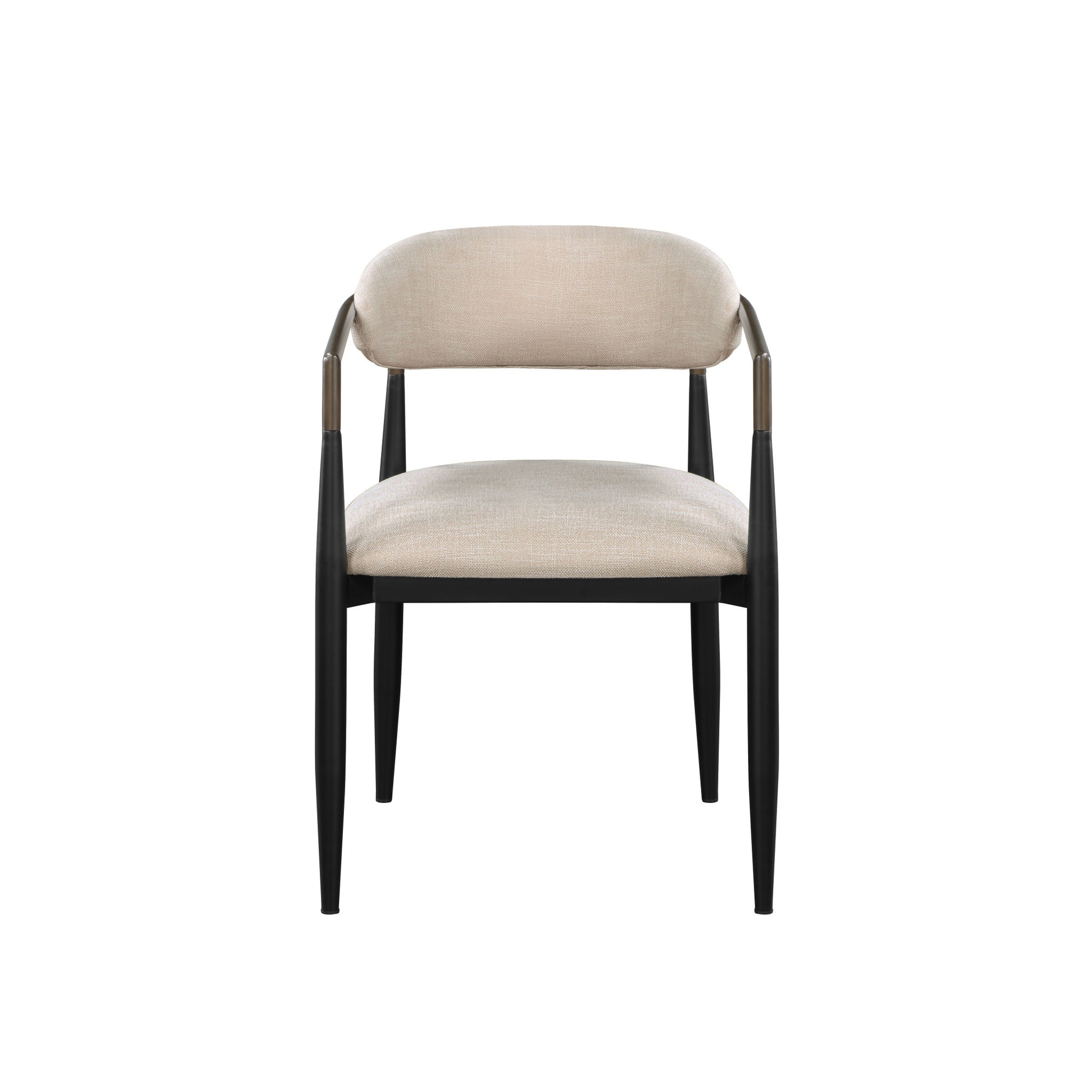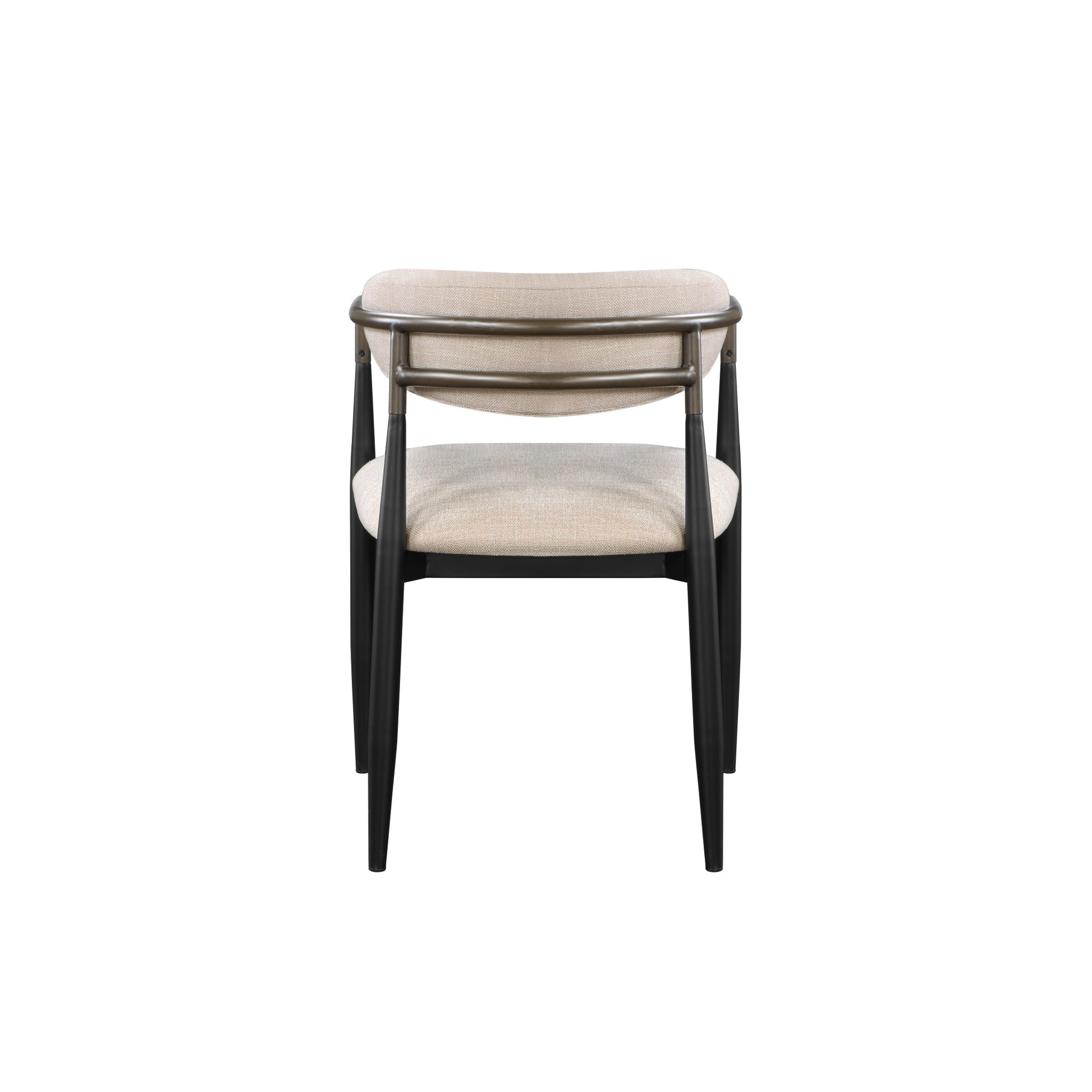 Make your dining experience the best with this set of two beige and black upholstered fabric open back dining arm chairs. The curved and partially open back gives this chair its unique style. Dining chairs are a great way to compliment your kitchen or dining room but can also be used in the foyer, hallway, or any room you might need extra seating.
