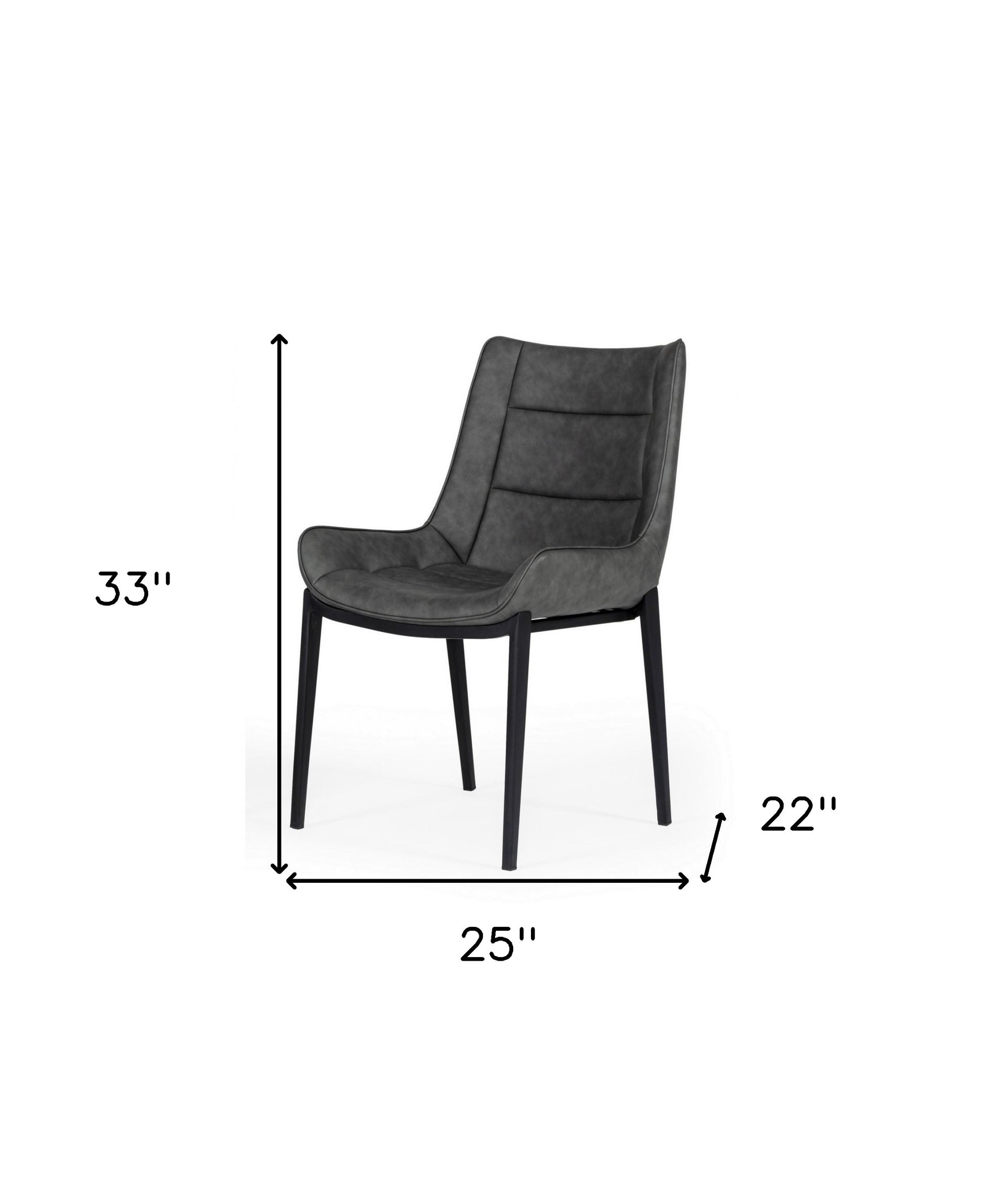 Add a stylish touch to your kitchen or dining room with the Gray Faux Leather Dining Chair Set of 2. This extraordinary chair with a metal base and legs is masterfully upholstered with premium-quality faux leather in a wide horizontal channel stitching pattern. With its soft curves, elegant silhouette, and ergonomic design it is both appealing and extremely comfortable. A perfect choice for contemporary and industrially-styled homes! 33" H x 25" W x 22" D