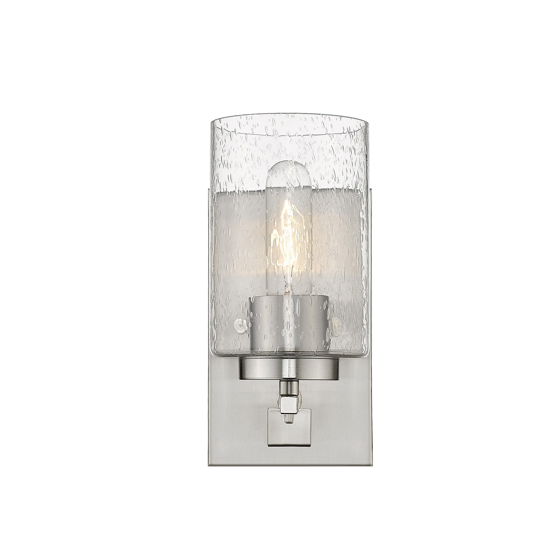 With this Silver Metal and Textured Glass Wall Sconce you add some style and brightness to any space in your home. The wall bracket has a rectangular shape and a silver finish on it. There is a horizontal rod attached to the wall bracket which holds the light up. The light shade is made of solid glass which has a rain drop textured effect on it. The contrast between the silver metal hardware and textured glass shade gives this wall sconce a very unique look. You can use this wall sconce in your hallway, your living room, or in your kitchen. 8.75" H x 4.5" W x 5.75" D