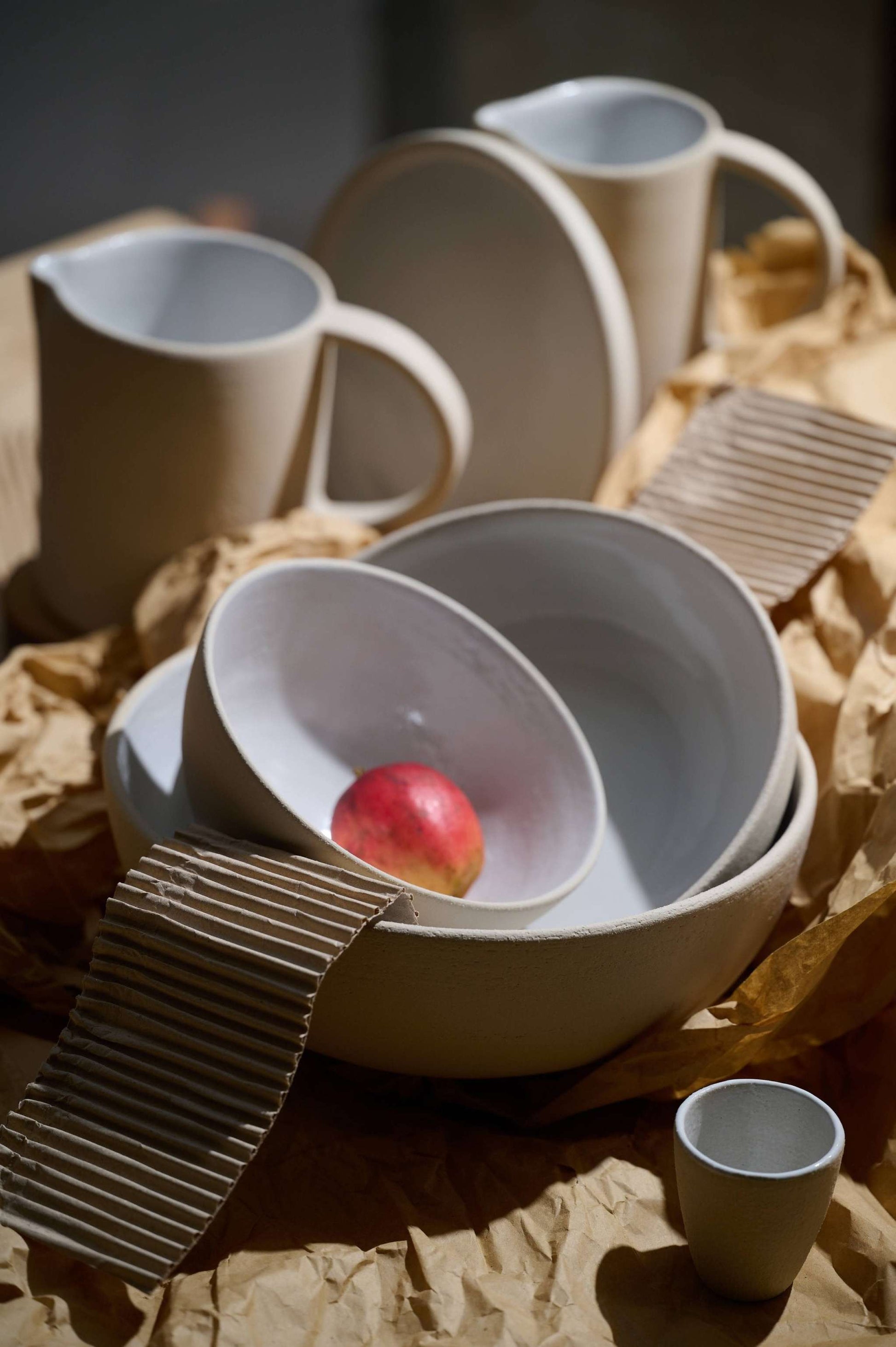 This is the most honest ceramic ware we have ever produced - exposed rough stoneware shows occasional signs of the artisans' fingers that were left during the hand-throwing process. The sides were smoothed but one can still see stoneware pores as if the dinnerware is breathing. The inside is covered with opaque white glaze for convenient use.